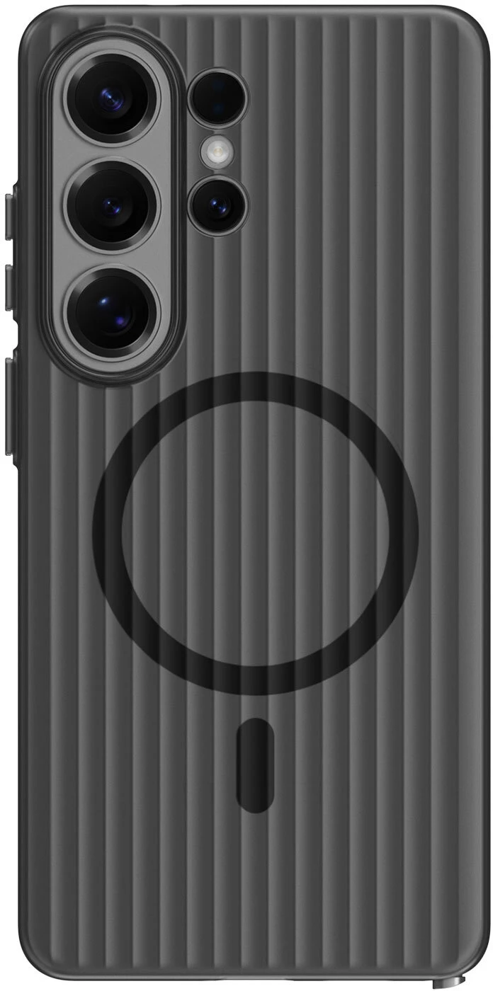 Das 4smarts Aero Riffel-Design Case für Samsung Galaxy S26 Ultra kombiniert minimalistisches Design mit hochwertiger Funktionalität – inspiriert vom ikonischen Look edler Aluminium-Reisekoffer.